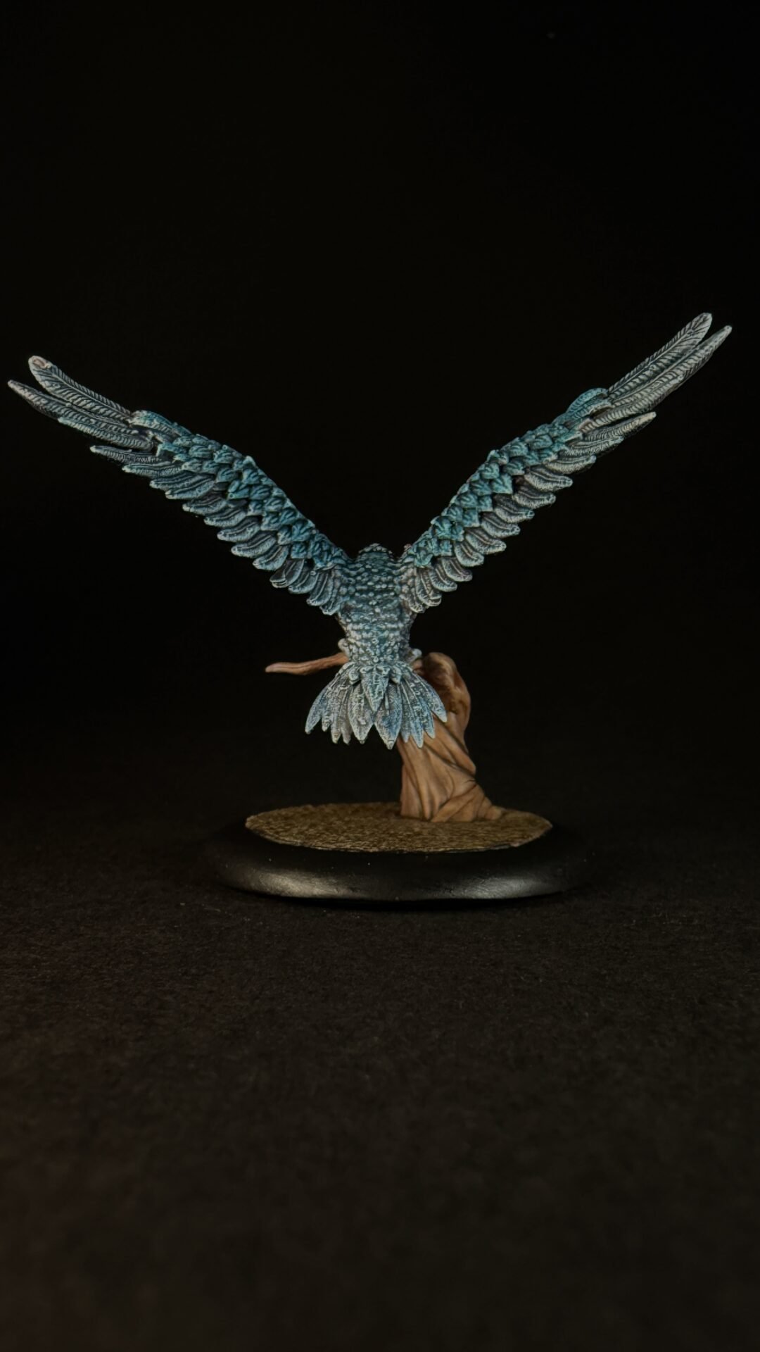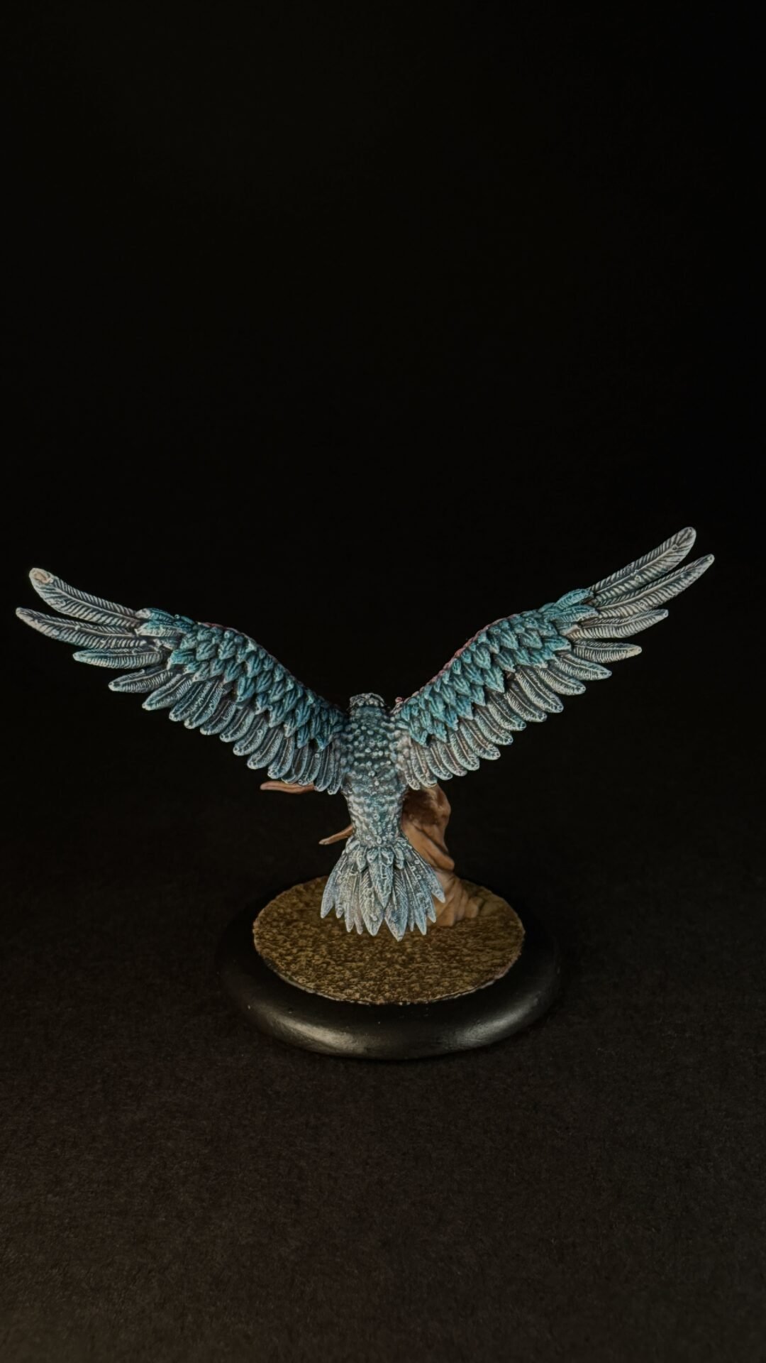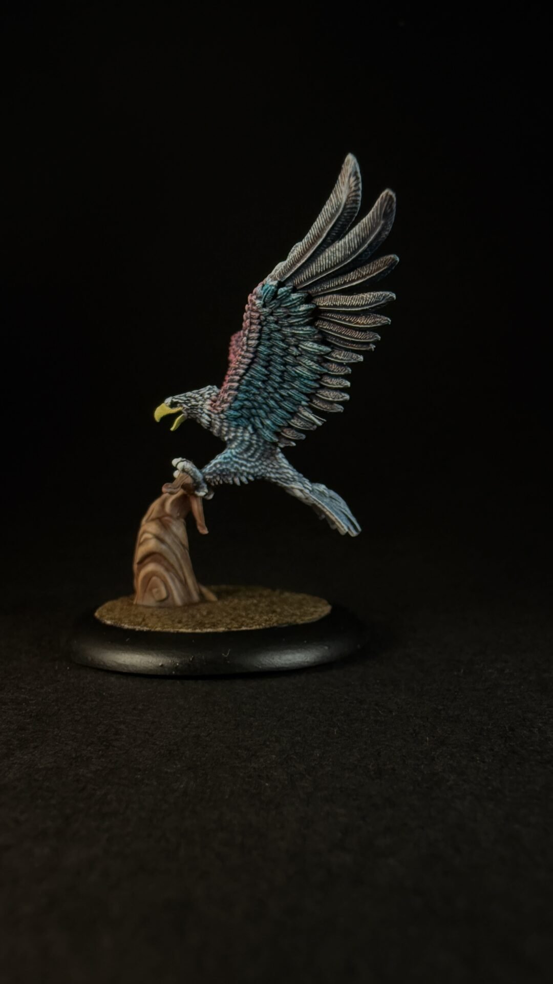 I’ve been working on Frelsi with the idea being to use the same colours as I’ve used for the team. Or more accurately make it look like the team colours are based on Frelsi. It’s not the best rendition of feathers you will ever see but I’m really happy with how it looks. The only thing that has me a little worried is how precarious it looks on the base. Swooping down to take a perch on a branch to survey the field.