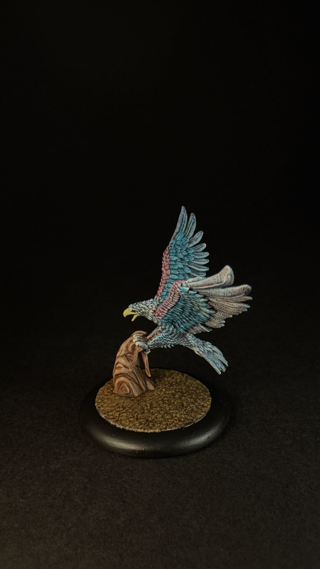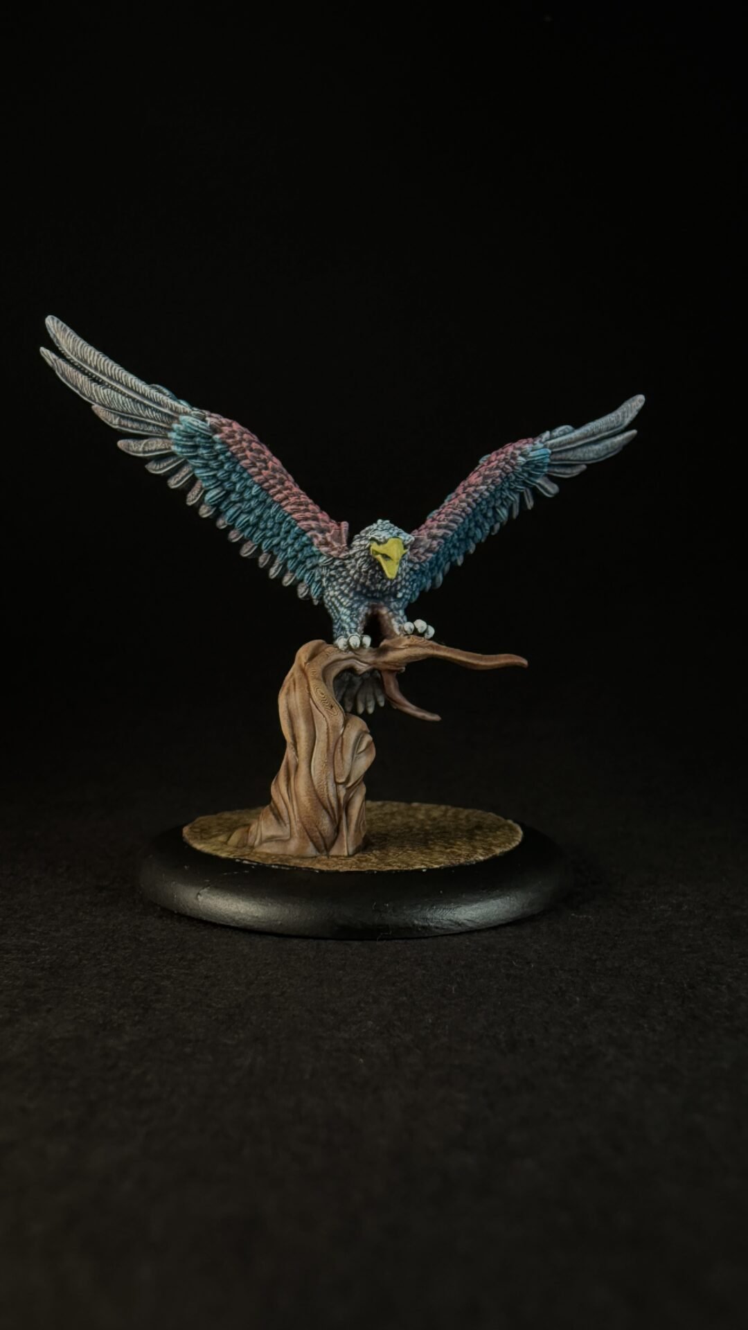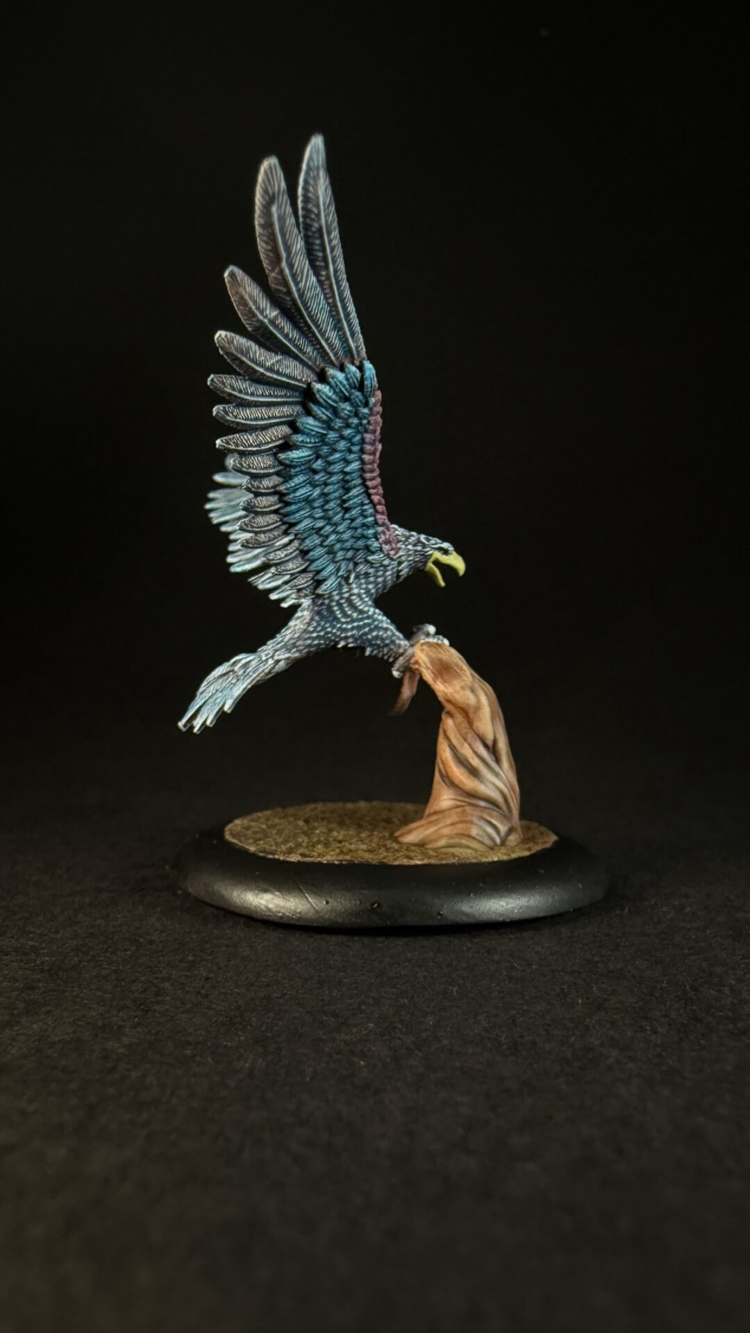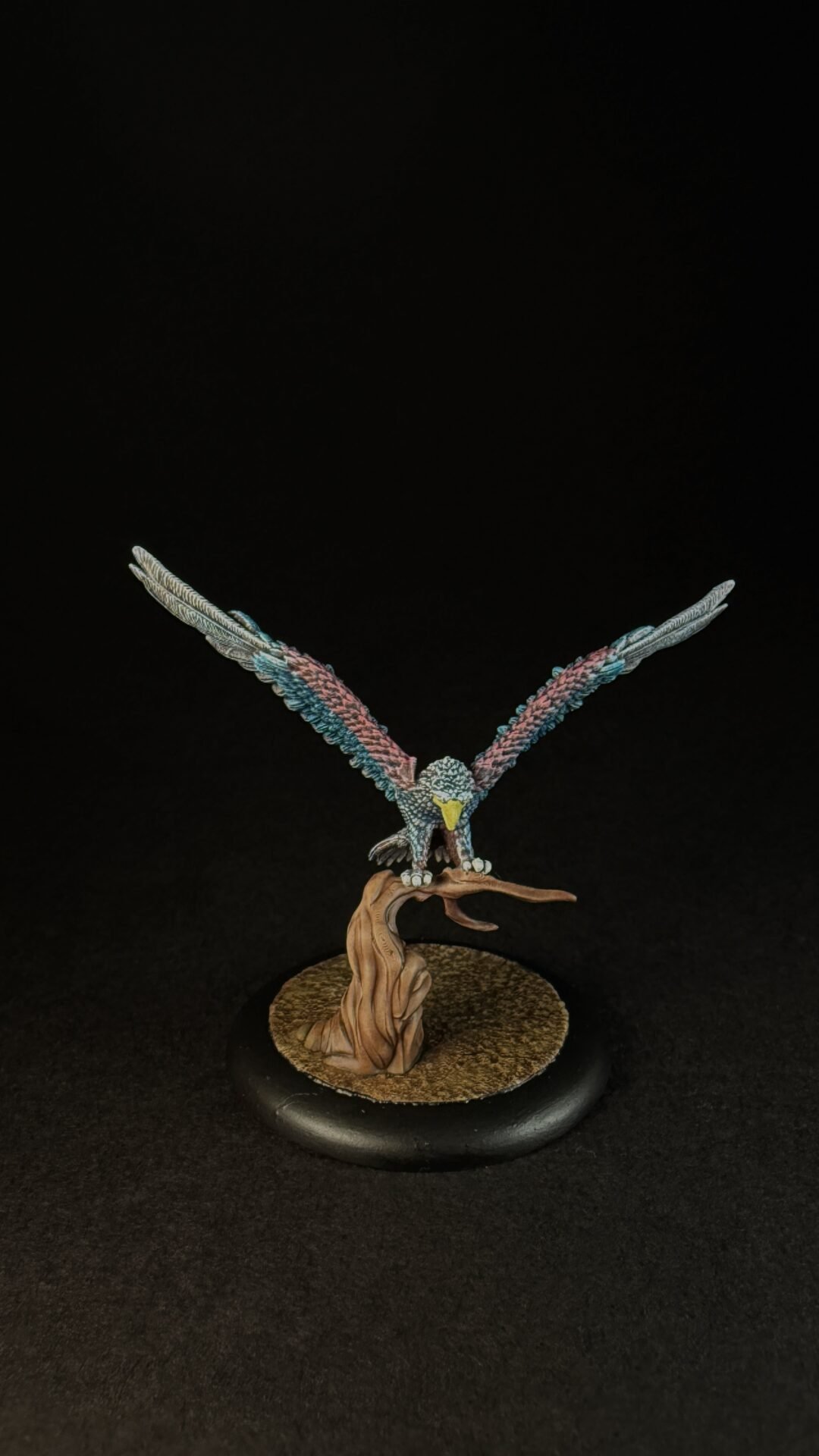 I’ve been working on Frelsi with the idea being to use the same colours as I’ve used for the team. Or more accurately make it look like the team colours are based on Frelsi. It’s not the best rendition of feathers you will ever see but I’m really happy with how it looks. The only thing that has me a little worried is how precarious it looks on the base. Swooping down to take a perch on a branch to survey the field.