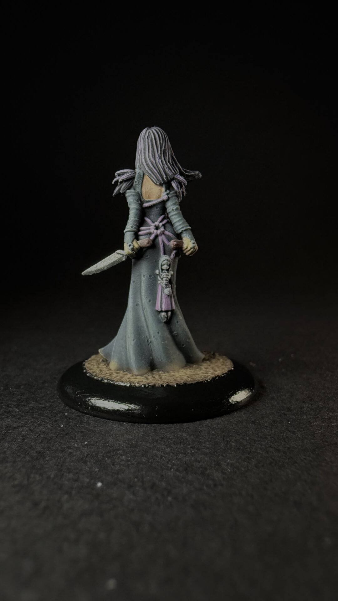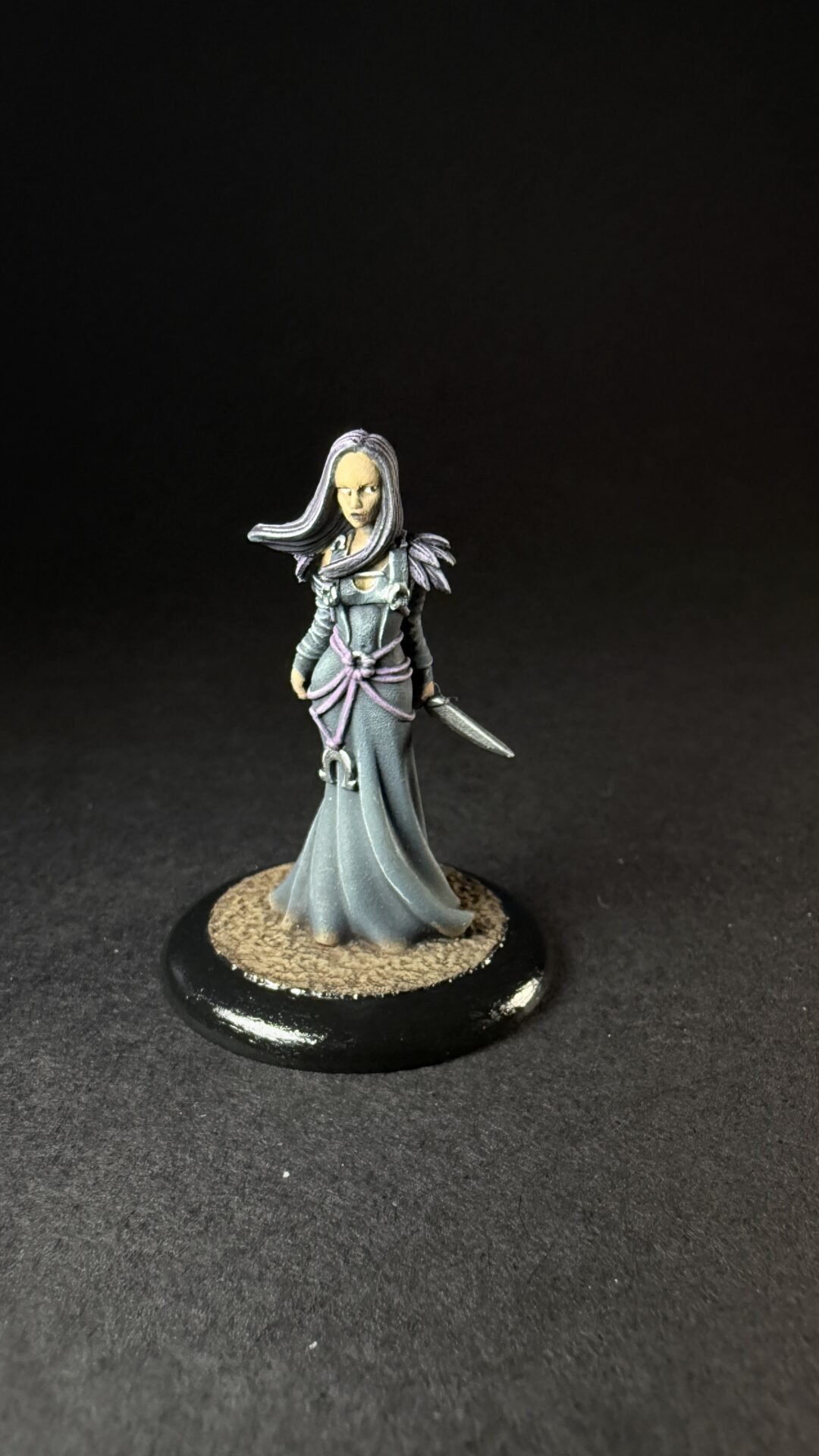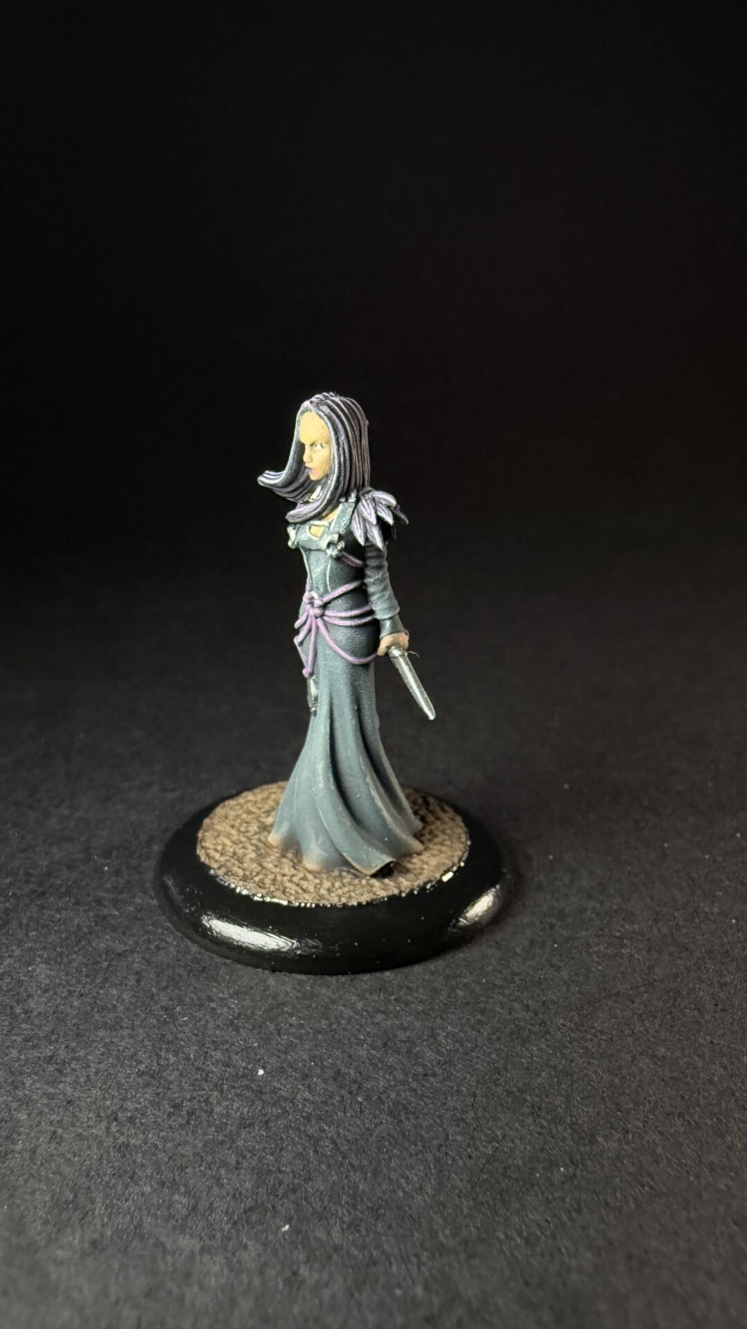 So this week I’ve been continuing, or given the break over Christmas I’ve gone back to my morticians. I think I have five or six of them to get finished so this week I have been working on Cosset. She is very nice mini although as you will see from the pictures I have broken one of knives and I can’t find the blade a the moment. But I am confident it will be in the box with the other minis somewhere. So for now I’ve decided that she has simply broken the blade off in another player who really annoyed her.